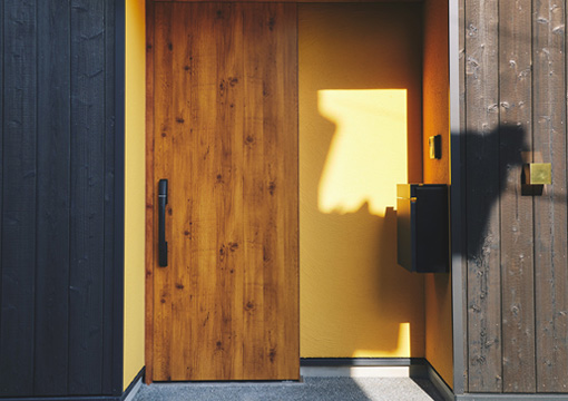 玄関は家の顔。丁寧に塗上げた品のある壁や、無垢材ならではの風合いを感じる軒裏がお出迎え。
